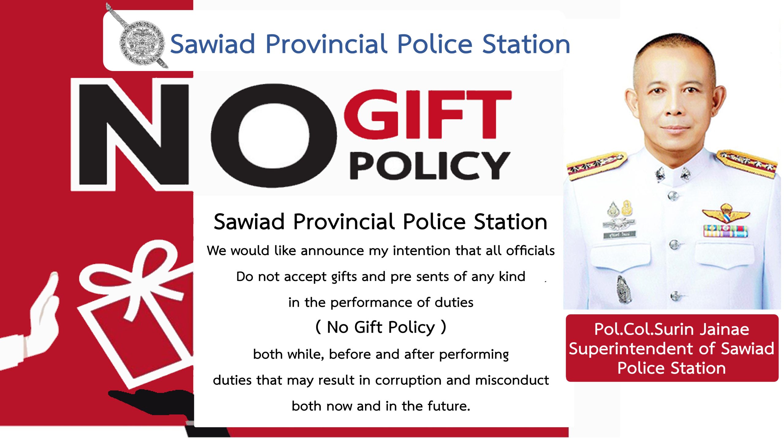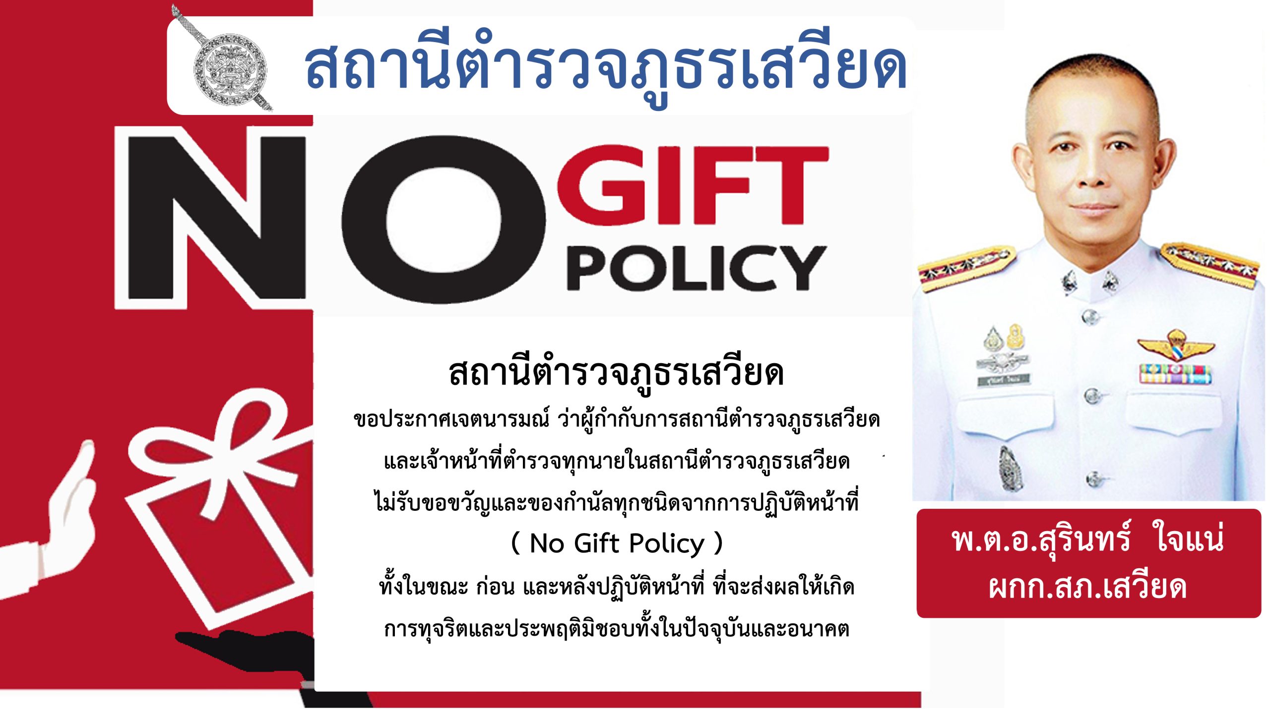 - ประกาศสำนักงานยุทธศาสตร์ตำรวจเรื่องเจตนารมณ์ที่จะไม่รับของขวัญหรือของกำนัลทุกชนิดจากการปฏิบัติหน้าที่