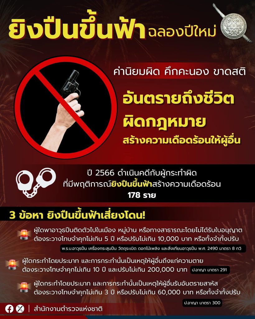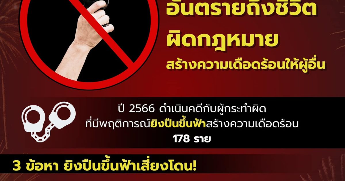 ‘ยิงปืนขึ้นฟ้า’ เฉลิมฉลองเทศกาลปีใหม่ ก่อให้เกิดอันตรายถึงชีวิต ผิดกฎหมาย และสร้างความเดือดร้อนให้ผู้อื่น ขอความร่วมมือประชาชน ให้ความร่วมมือเป็นหูเป็นตา