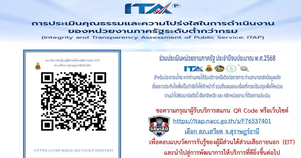 ขอเชิญร่วมการประเมินคุณธรรมและความโปร่งใสในการดำเนินงานของสถานีตำรวจภูธรเสวียด ประจำปีงบประมาณ 2568
