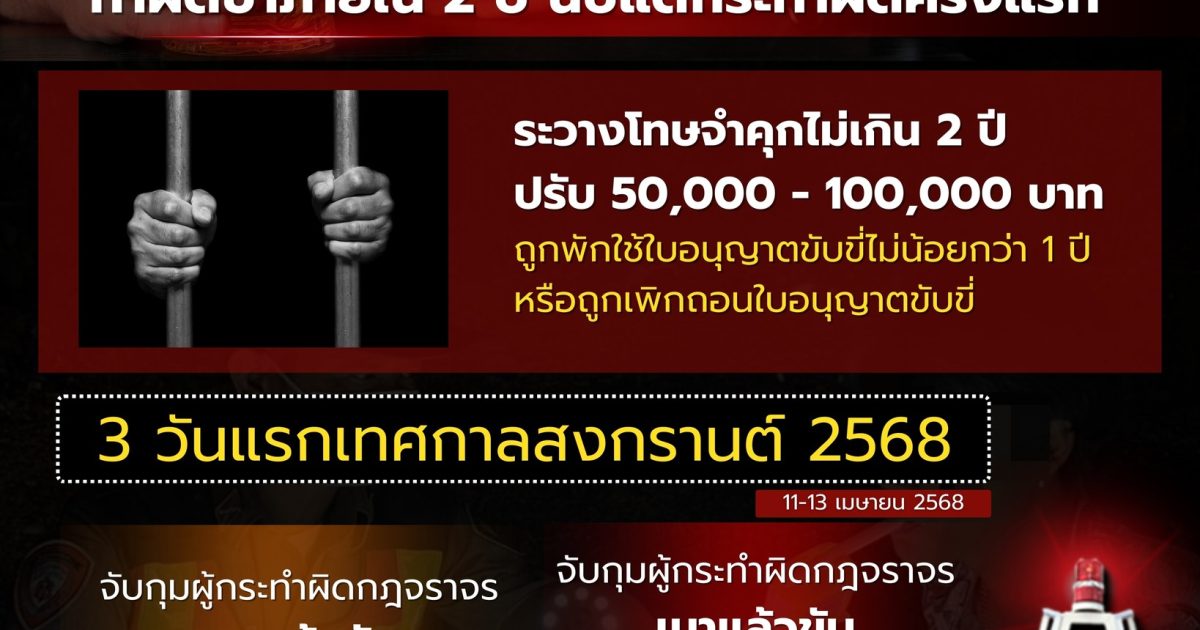 เมื่อวันที่ 14 เมษายน 2568 พล.ต.ท.นิธิธร จินตกานนท์ ผู้บัญชาการศึกษา ในฐานะหัวหน้าคณะทำงานฝ่ายเสริมสร้างภาพลักษณ์ตำรวจจราจร ศูนย์บริหารงานจราจร สำนักงานตำรวจแห่งชาติ เปิดเผยว่า ตามที่ศูนย์อำนวยการป้องกันและลดอุบัติเหตุทางถนน สำนักงานตำรวจแห่งชาติ สรุปการเกิดอุบัติเหตุช่วงเทศกาลสงกรานต์ 2568 สะสม 3 วัน (11-13 เมษายน 2568) มียอดจับกุม เมาแล้วขับสูงถึง 11,801 ราย ซึ่งในจำนวนนี้มีผู้ที่ถูกตรวจพบว่าเป็นการกระทำผิดซ้ำ ภายใน 2 ปี นับแต่วันที่กระทำความผิดครั้งที่ผ่านมา มากถึง 63 ราย