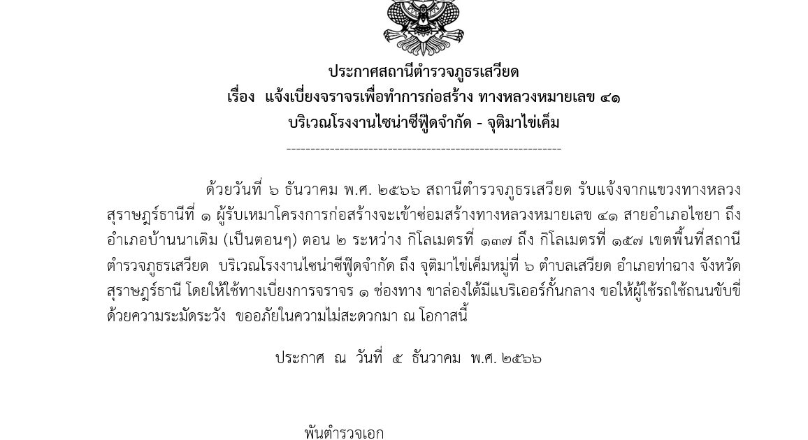 แจ้งเบี่ยงจราจรเพื่อทำการก่อสร้าง ทางหลวงหมายเลข 41 สาย ไชยา-อ.บ้านนาเดิม (เป็นตอนๆ) ตอน 2 โดยจะเริ่มทำการปิดทางเบี่ยงการจราจร ช่วงกม.141+800.00 – กม.143+100.00 ตั้งแต่วันที่ 6 ธ.ค. 66 – 28 ก.พ. 67