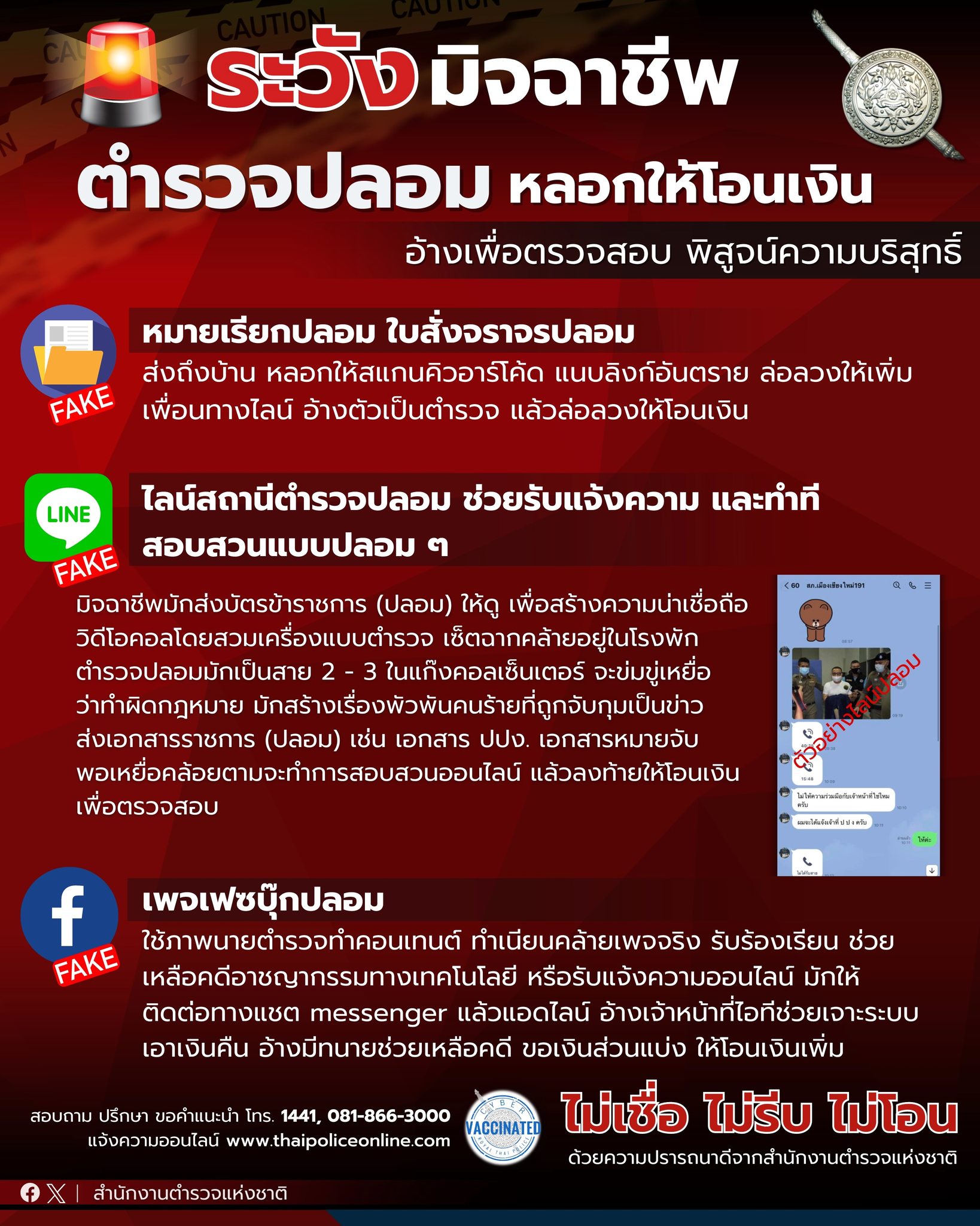 โปรดระวังมิจฉาชีพ 3 รูปแบบ “ตำรวจปลอม” หลอกให้โอนเงินอ้างเพื่อตรวจสอบ แสดงความบริ