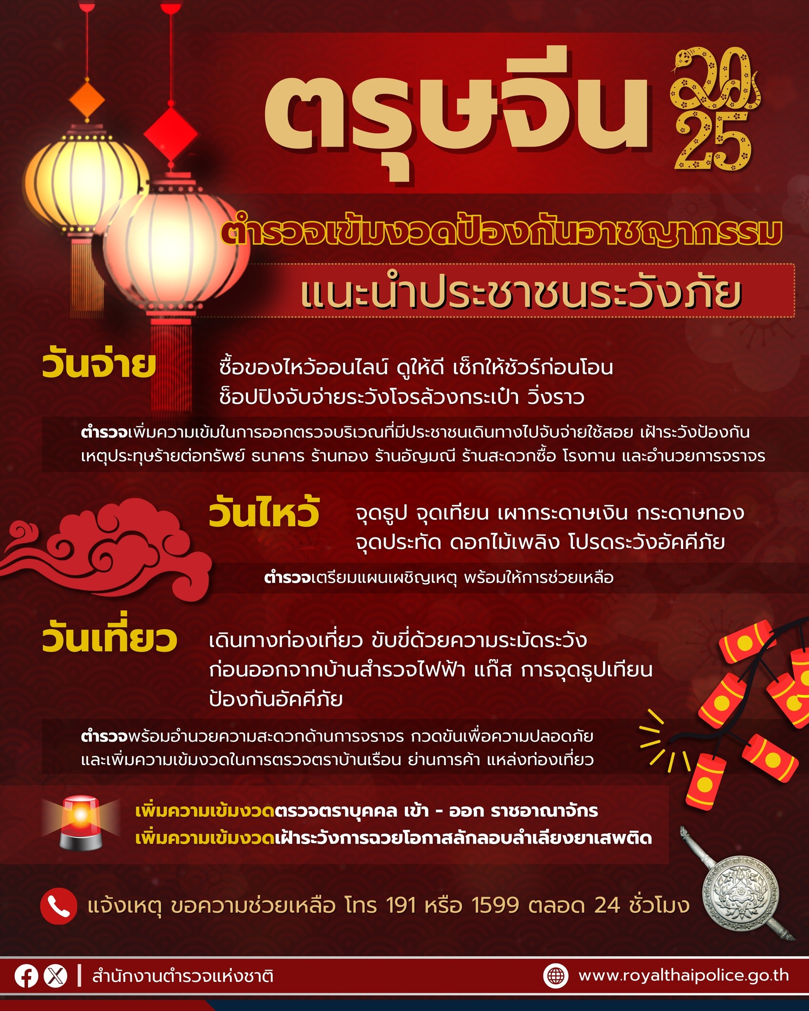 สำนักงานตำรวจแห่งชาติมีมาตรการเข้ม ดูแลประชาชนช่วงเทศกาล #ตรุษจีน 2568 ทั้งวันจ่าย วันไหว้ วันเที่ยว