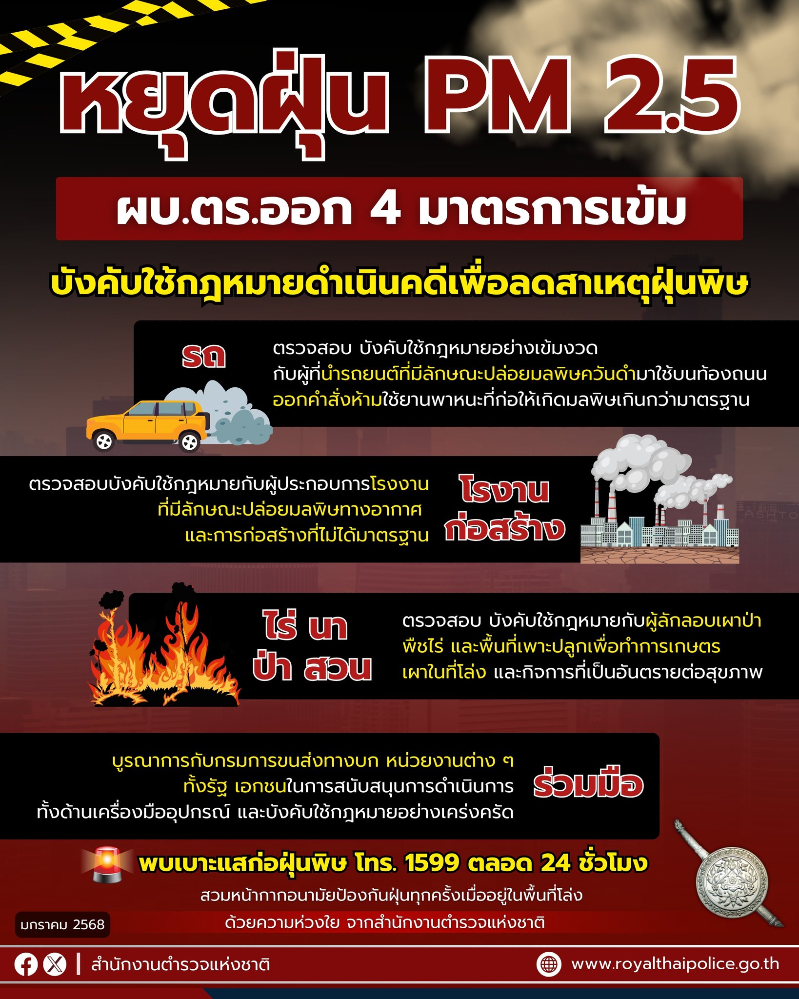 หยุดฝุ่น PM 2.5 ผบ.ตร. ออก 4 มาตรการบังคับใช้กฎหมาย ดำเนินคดีเข้ม เพื่อลดสาเหตุการเกิดฝุ่นละออง PM 2