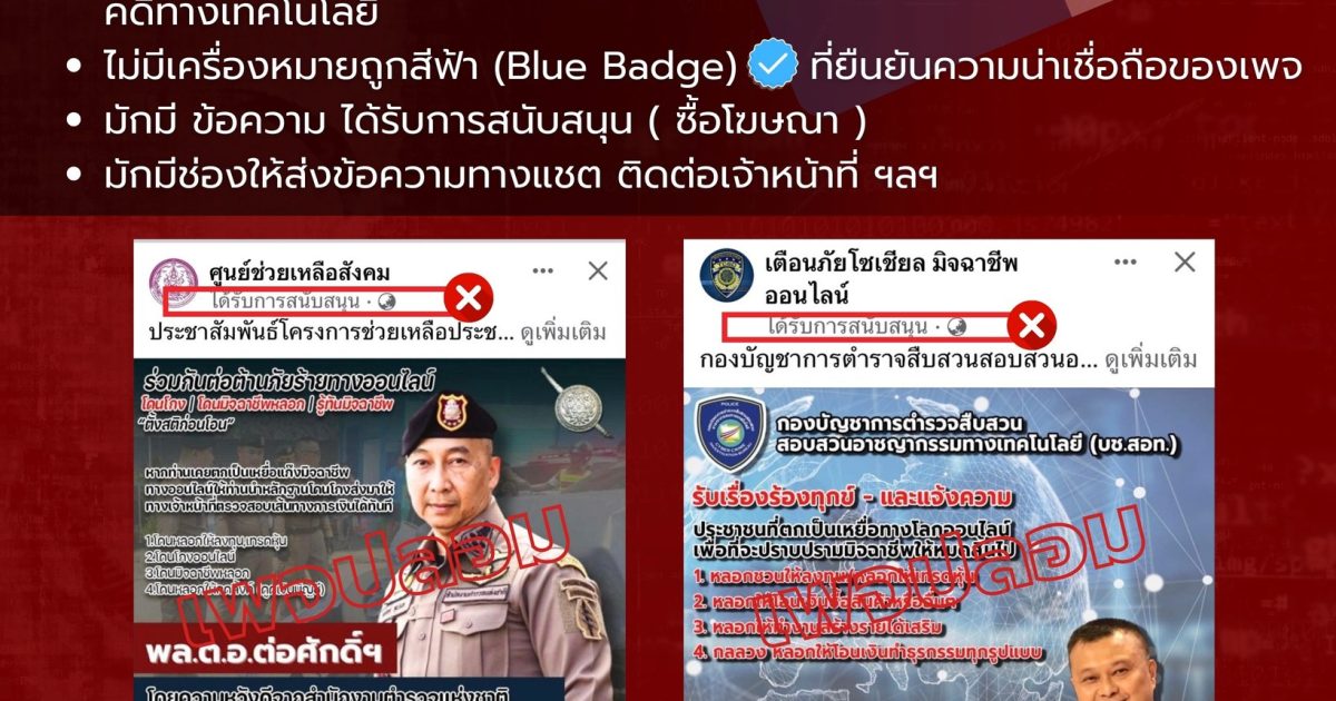 ขณะนี้พบว่ามีมิจฉาชีพสร้างเพจเฟซบุ๊กปลอมจำนวนมาก โดยใช้ภาพ และโลโก้ของตำรวจ มีเนื้อหาให้ความรู้ เตือนภัย คล้ายของจริง อ้างรับแจ้งความออนไลน์ ช่วยเหลือคดี ที่แท้มิจฉาชีพหลอกให้ทักแชต สนทนาส่งลิงก์อันตรายดูดเงิน หลอกพูดคุยลวงให้โอนเงิน ฯลฯ