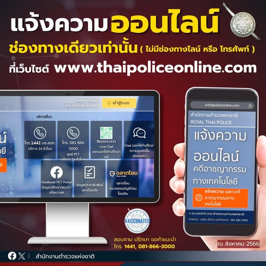 แจ้งความออนไลน์ ช่องทางเดียวเท่านั้นที่เว็บไซต์ www.thaipoliceonline.com .กรณีตกเป็นเหยื่อเกี่ยวกับก